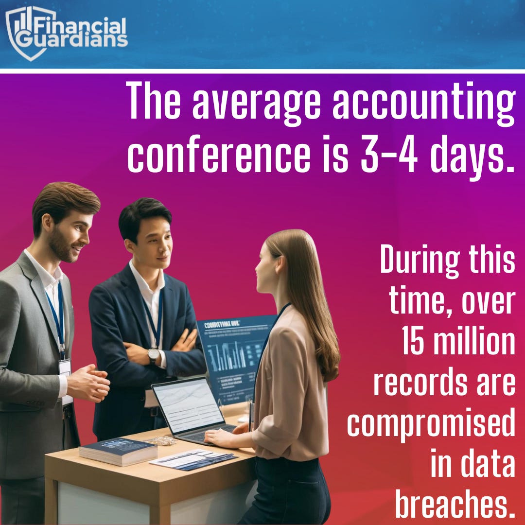 In May every year, after what the world calls tax season ends, the accounting, tax preparation, bookkeeping, and financial services industry begins conference season. The average conference lasts 3-4 days, during which time dozens of topics are discussed to improve knowledge, increase efficiencies, and expand networks. Over 15 million records are stolen in data breaches during the average conference.